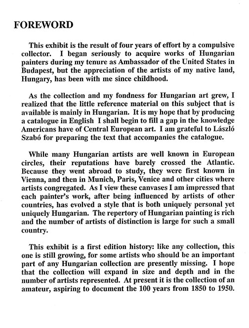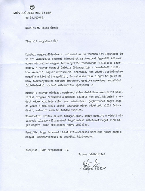 Nicolas Salgo began collecting Hungarian art while he was American Ambassador to Hungary during the mid 1980s. He branched out into old Hungarian silver, old Hungarian maps, old Hungarian coins, and Hungarian folk art. After he left his post as Ambassador to Budapest he received special ministerial permission to export the most important works, which had “védett,” that is “protected” status and would therefore normally not be exportable. This permission was given with the understanding of the then Minister of Culture Dr. Béla Köpeczi that the works would be employed to make Hungarian art better known abroad. Ambassador Salgo’s efforts and legacy have more than fulfilled this objective since that time. The large and fine collection of modern Hungarian art is internationally renowned and has been the source of many loans to exhibitions.