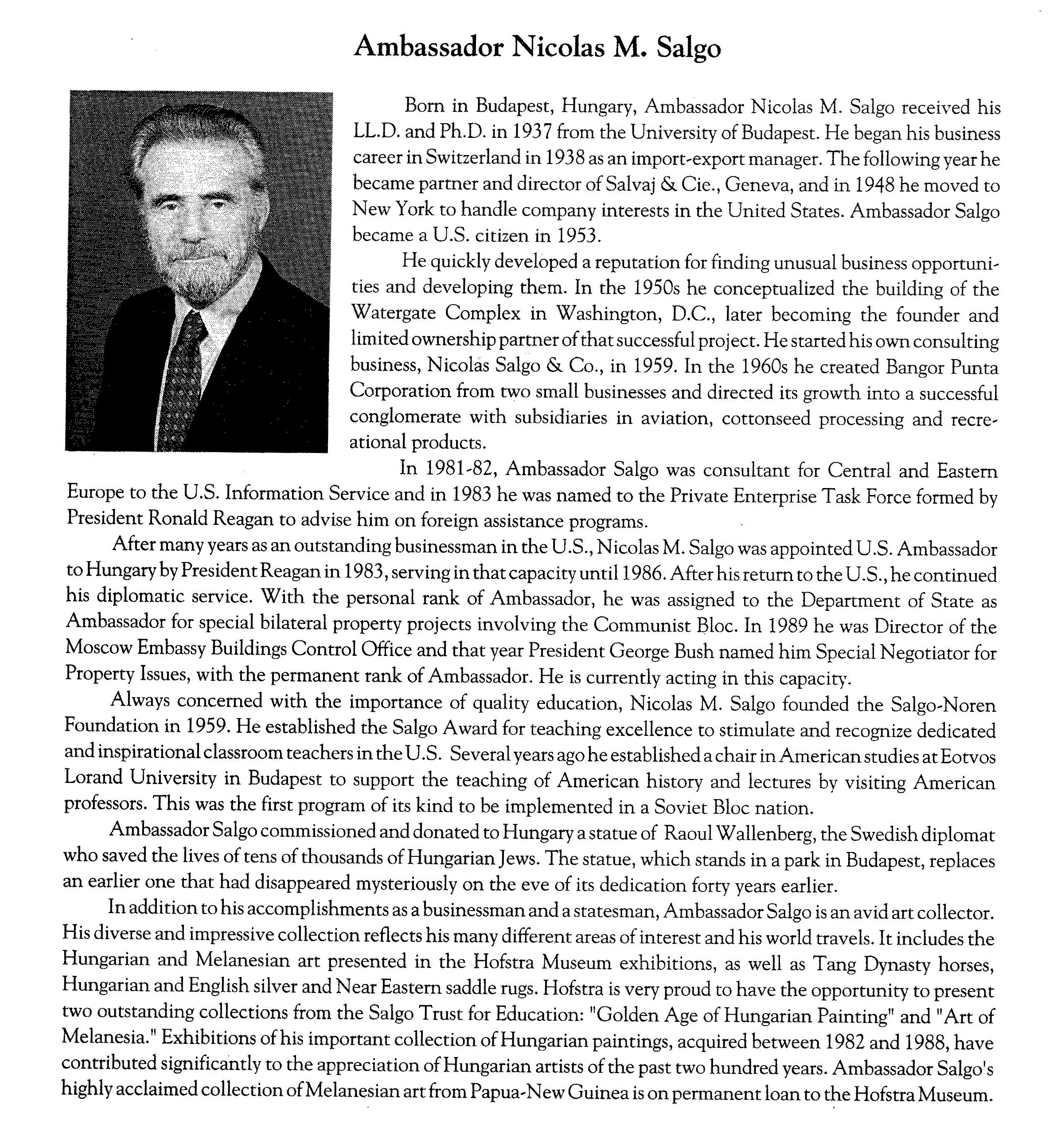 Nicolas M. Salgo was appointed U.S. Ambassador to Hungary by President Reagan in 1983, serving in that capacity until 1986. After his return to the United States, he continued his diplomatic service, being assigned to the Department of State as Ambassador for special bilateral property projects involving Eastern European nations. In 1989 President George Bush (Sr.) nominated him Special Negotiator for Property Issues, with the permanent rank of Ambassador, with Senate confirmation. In this capacity, Ambassador Salgo successfully negotiated property agreements with Bulgaria, East Germany, Israel, China and the USSR, as well as with all fourteen newly independent successor states to the USSR. He concluded many years of negotiations with Russia concerning the American Embassy in Moscow and facilitated the opening of new U.S. consulates.