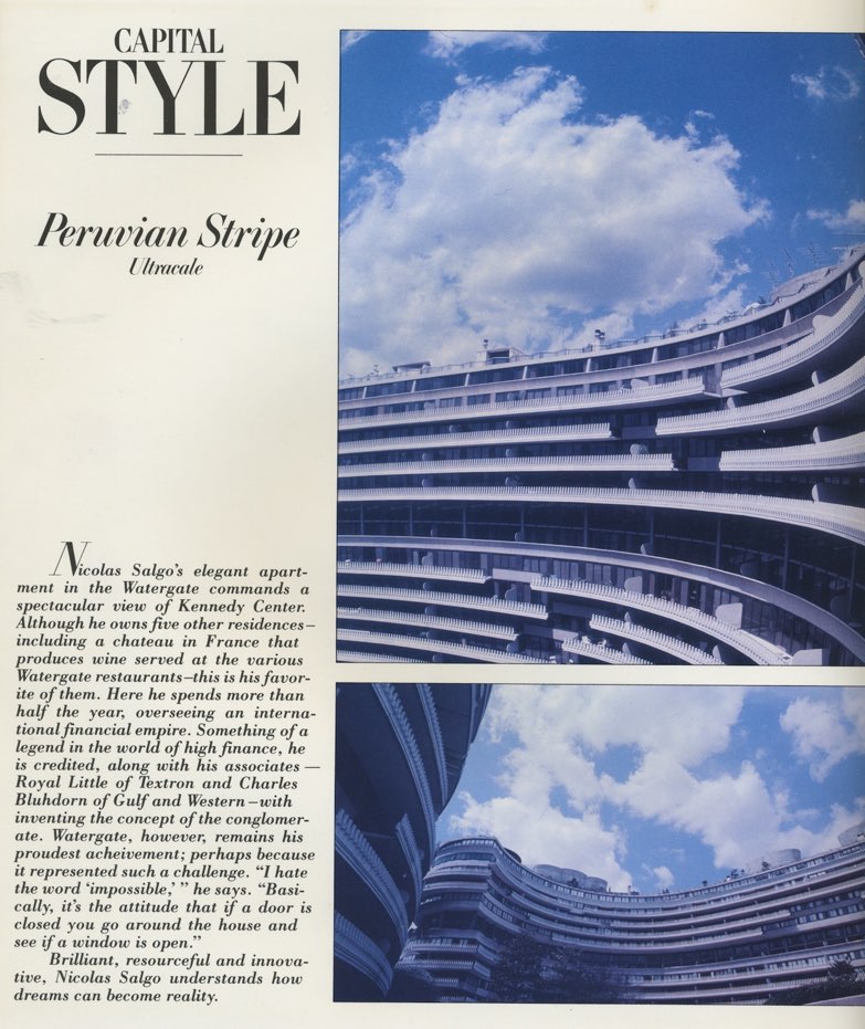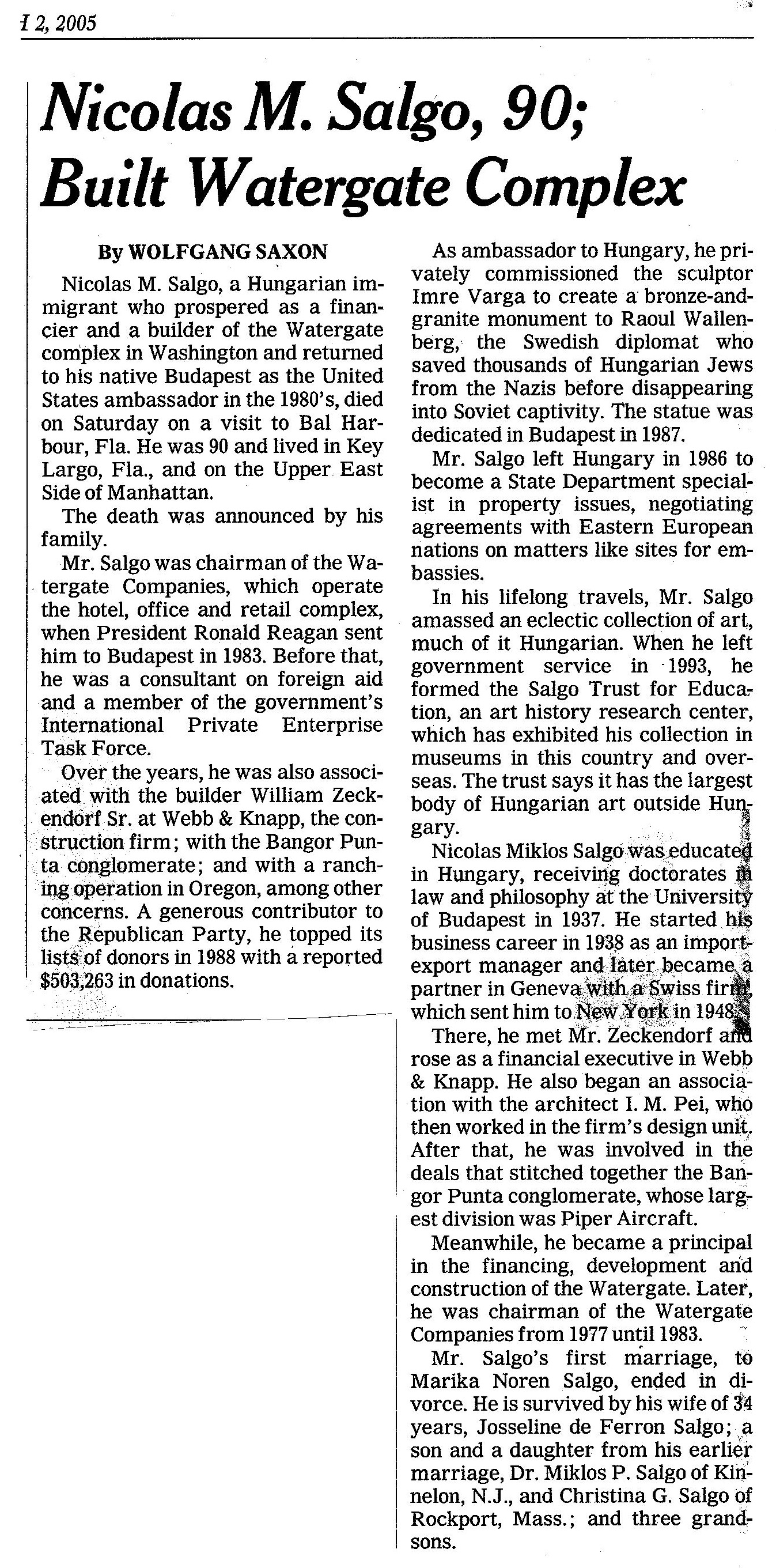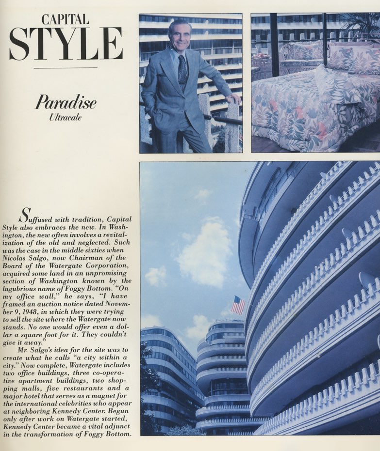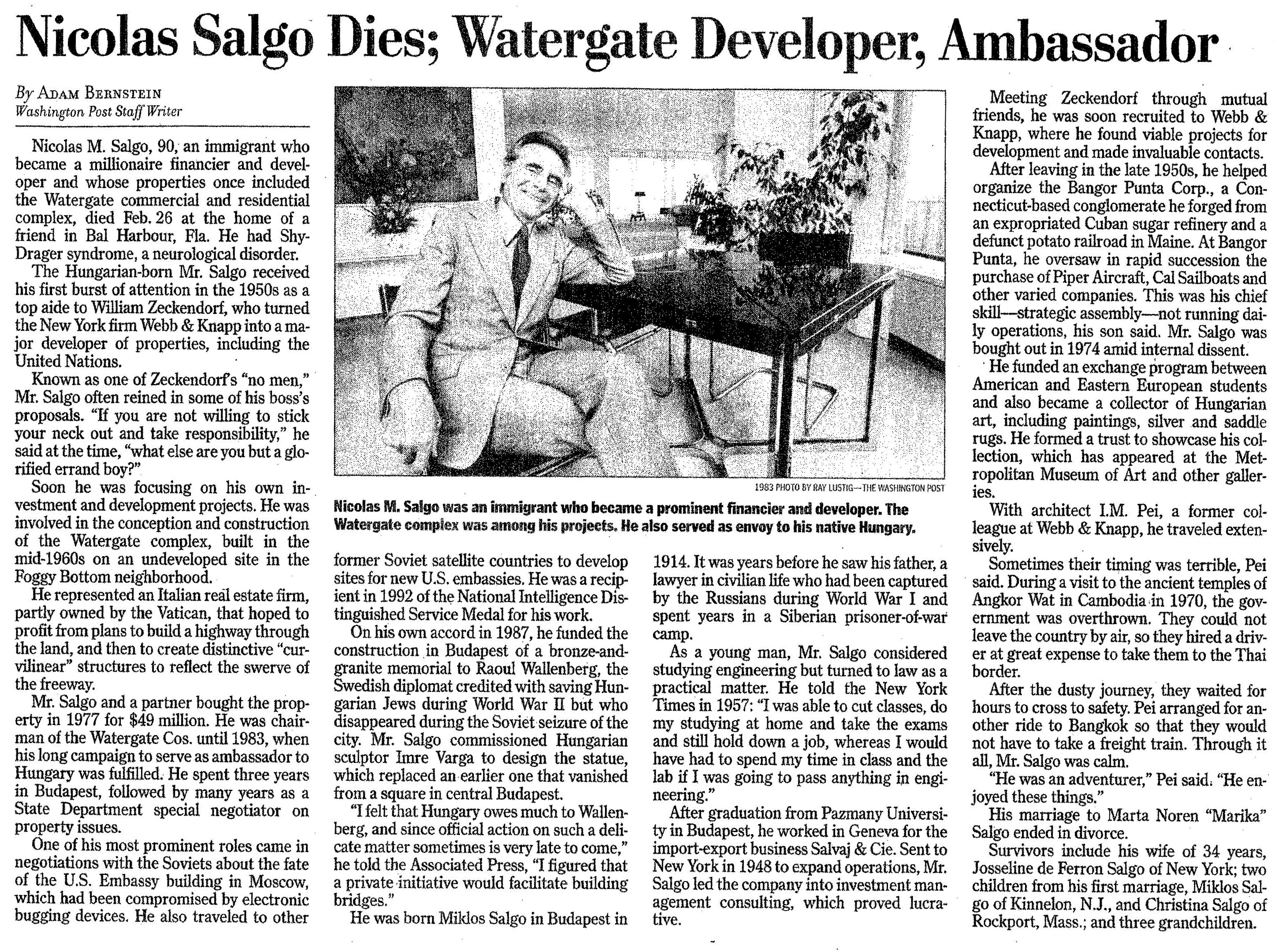 Ambassador Salgo became a United States citizen in 1953. He had already developed a reputation for finding and developing unusual business opportunities. By the 1960s, he had developed a successful conglomerate with subsidiaries in aviation, cottonseed processing and recreational products. He conceptualized the building of the Watergate Complex in Washington, D.C., becoming founder and limited ownership partner of that successful project.